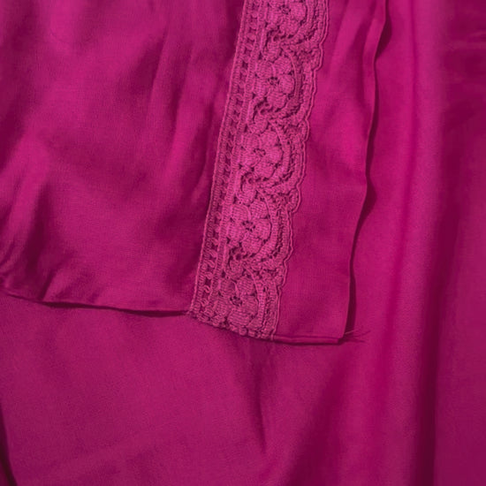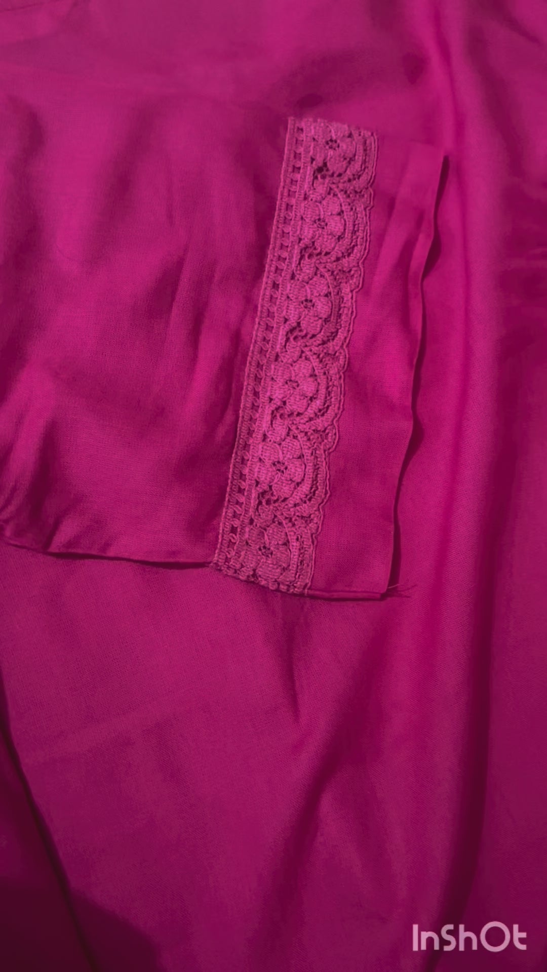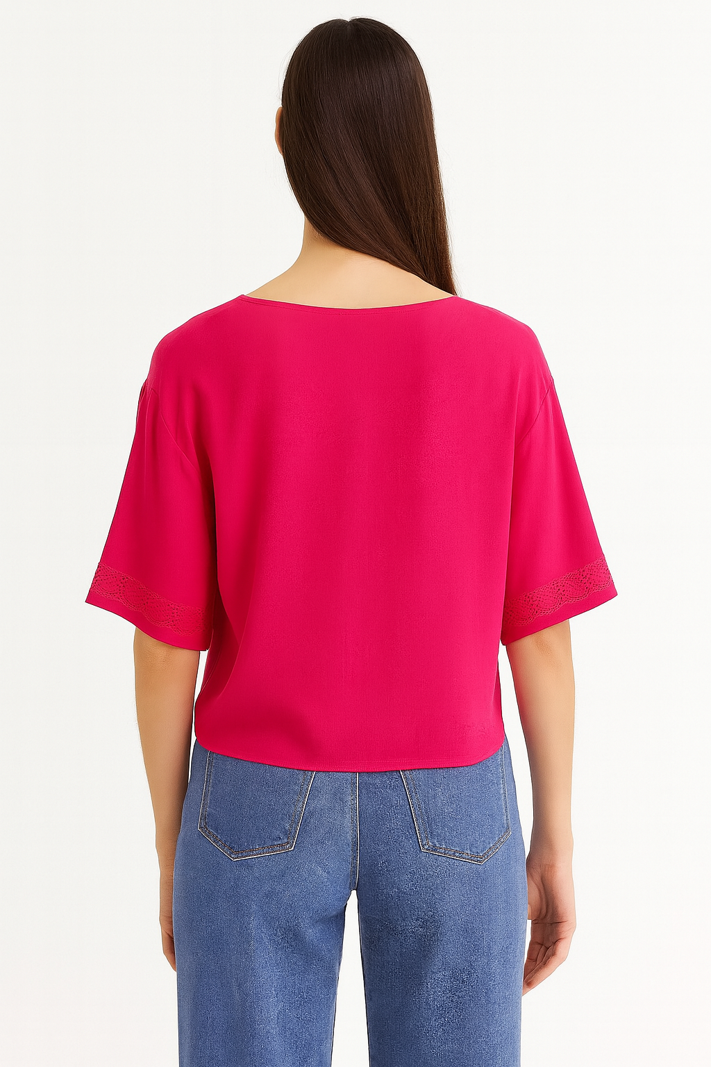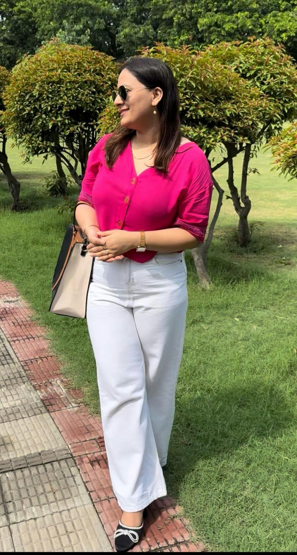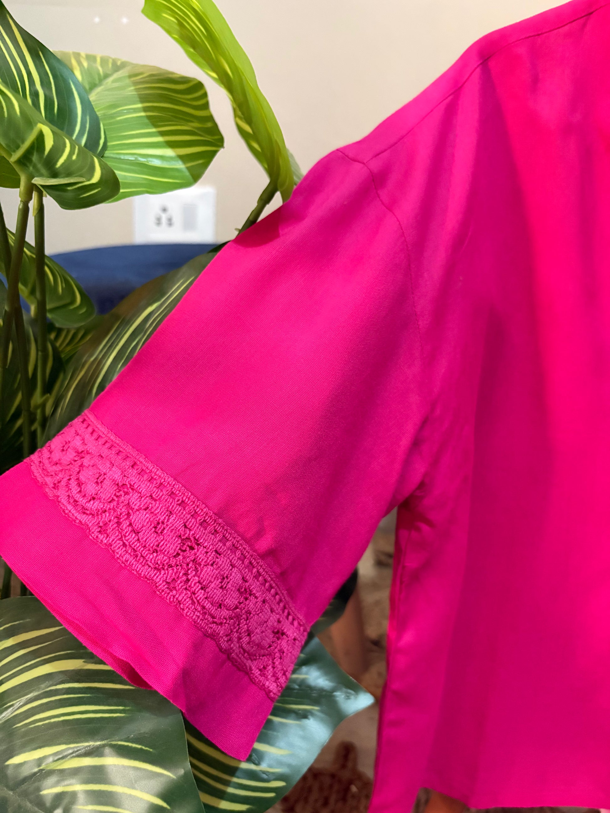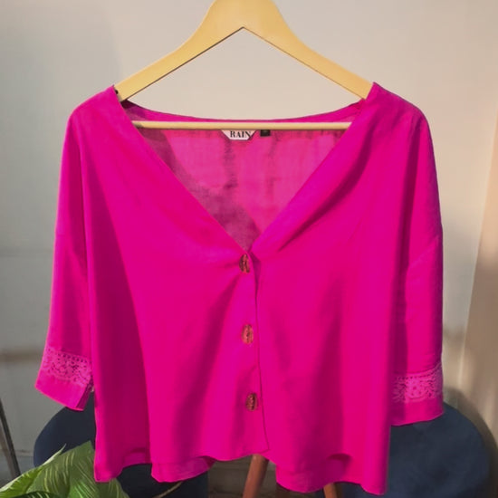 Brighten up your wardrobe with our Fuchsia Bloom Cropped Top — a vibrant and effortlessly chic addition to your everyday style. Crafted from soft and breathable rayon fabric, this top features a flattering deep V-neckline and relaxed drop-shoulder silhouette for all-day comfort. The standout details include wooden-look buttons that run down the front and a delicate tonal lace trim on the elbow-length sleeves, adding a touch of feminine charm. Its slightly cropped length makes it perfect for pairing with high-waisted trousers, denims, or skirts. Whether you’re stepping out for brunch or dressing up for an evening stroll, this top is your go-to for easy elegance.